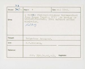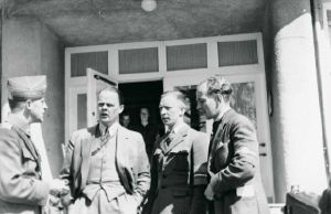 Maskingenkendt tekst fra fotokuvert: I midten regionsledelsens repræsentant Jens Kruse (region III), de øvrige er uidentificerede. Uden nærmere stedsangivelse.