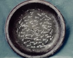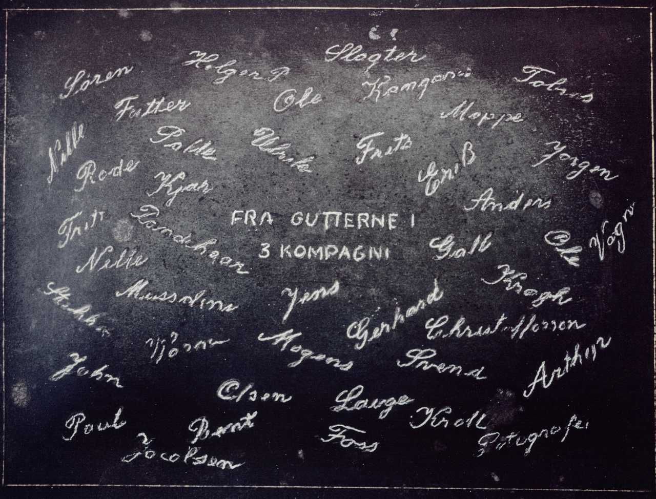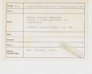 Maskingenkendt tekst fra fotokuvert: Holger Danske- Dæknavne ridset i rundt askebæger og Cigarkasse.
