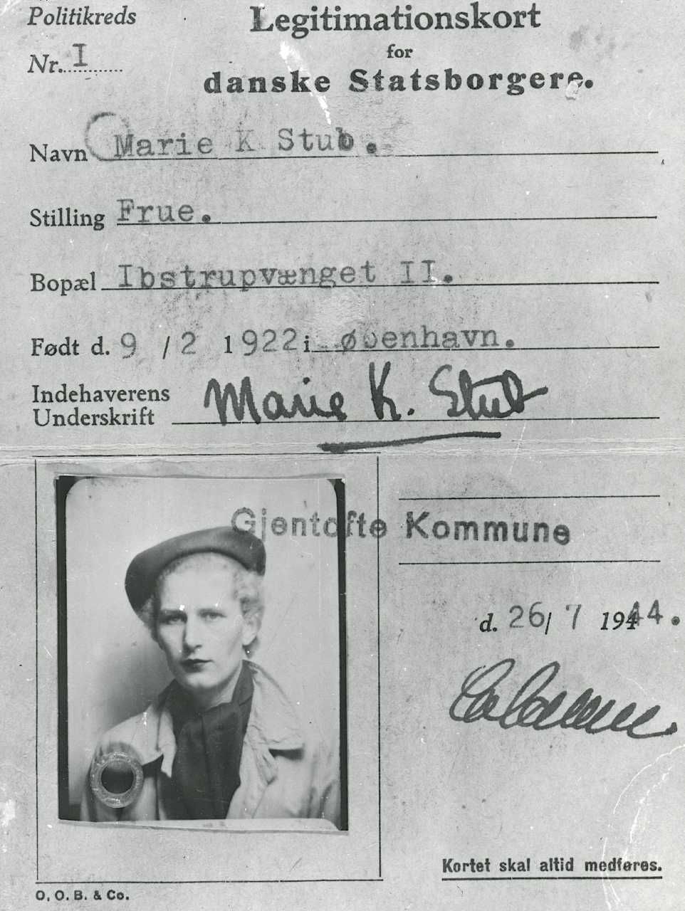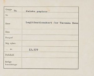 Falsk legitimationskort for Varinka Muus, der arbejdede som sekretær for faldskærmslederen i Danmark, Flemming B. Muus og blev gift med ham i sommeren 1944