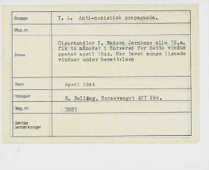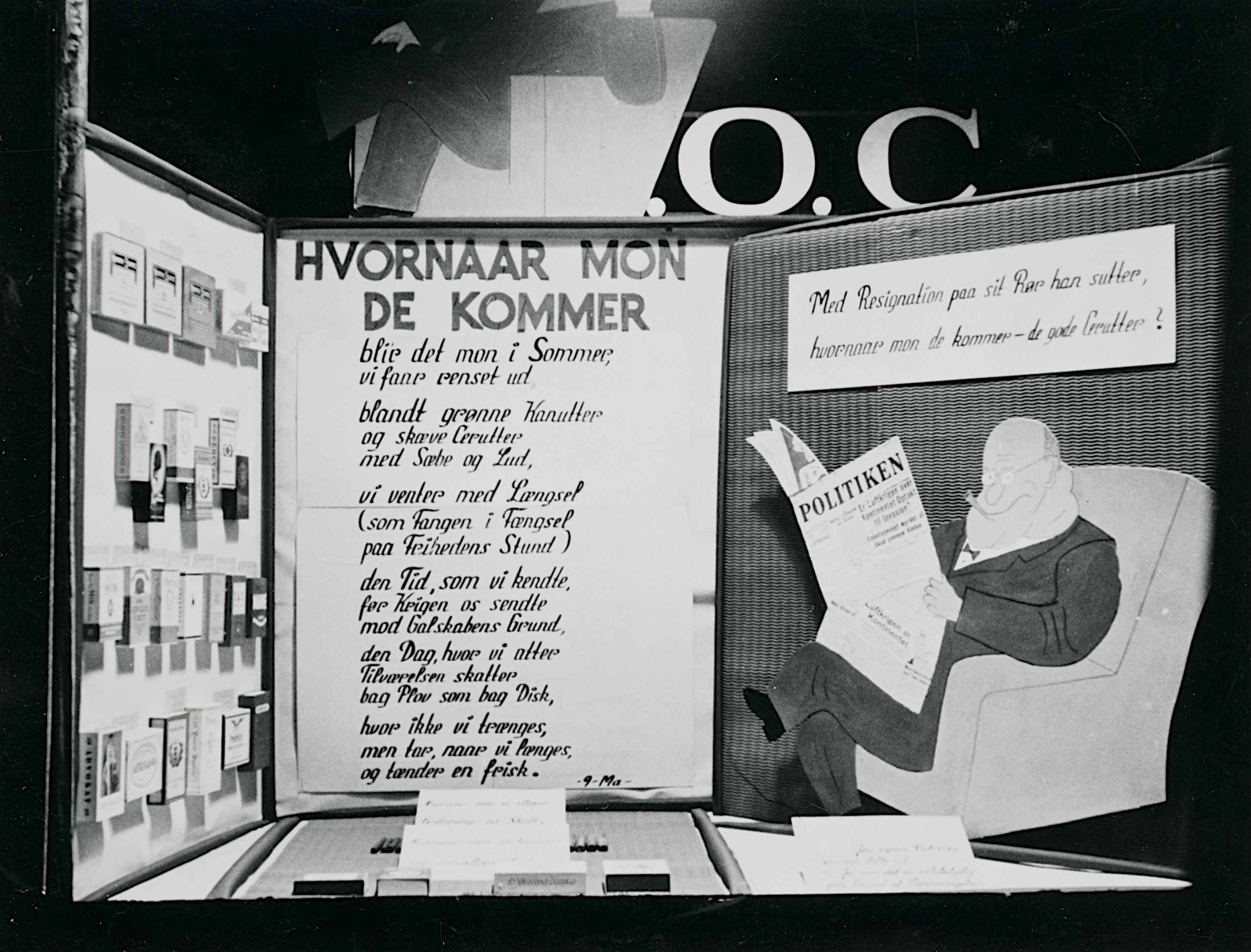 Antinazistisk vinduesudsmykning hos cigarhandler N. Madsen i Jernbane Allé i København i april 1944. Udsmykningen kostede cigarhandleren to måneder i Horserød