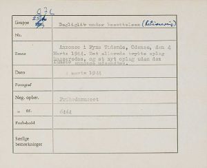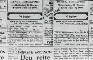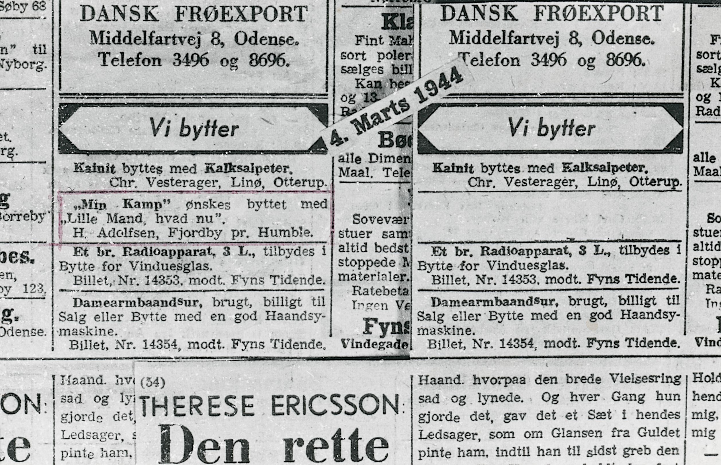 Maskingenkendt tekst fra fotokuvert: Annonce i Fyns Tidende, Odense, den 4. marts 1944. Det allerede trykte oplag kasseredes, og et nyt oplag uden den lamose annonce udsendtes.