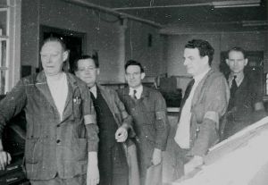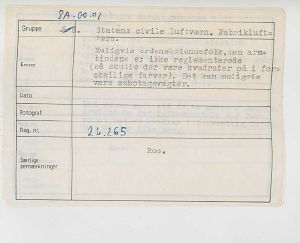 Maskingenkendt tekst fra fotokuvert: Muligvis ordenskolonnefolk, men armbindene er ikke reglementerede (så skulle der være kvadrater på i forskellige farver). Det kan muligvis være sabotagevagter.