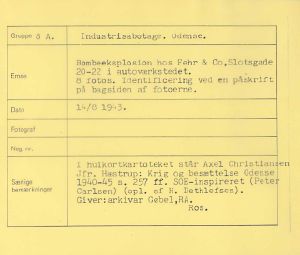 Maskingenkendt tekst fra fotokuvert: Bombeeksplosion hos Fehr & Co, Slotsgade 20-22 i autoværkstedet.