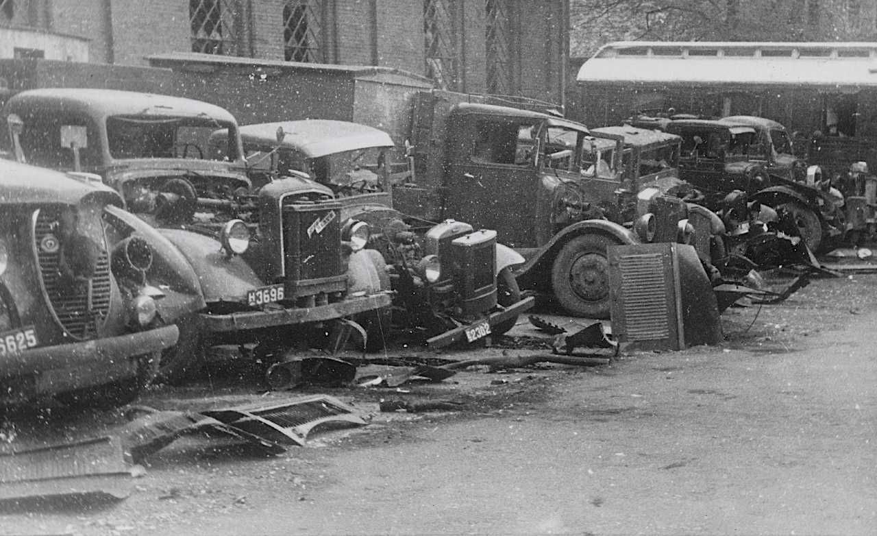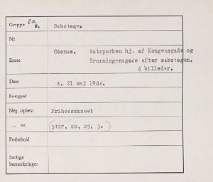 Maskingenkendt tekst fra fotokuvert: Odense. Autoparken hj. af Kongensgade og Dronningensgade efter sabotagen