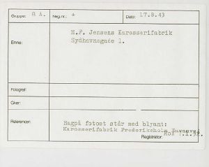 Maskingenkendt tekst fra fotokuvert: H.F. Jensens Karosserifabrik Sydhavnsgade 1.