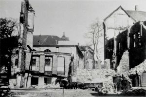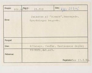 Maskingenkendt tekst fra fotokuvert: Ruinerne af Always, Boyesgade. Oprydningen begyndt.