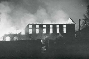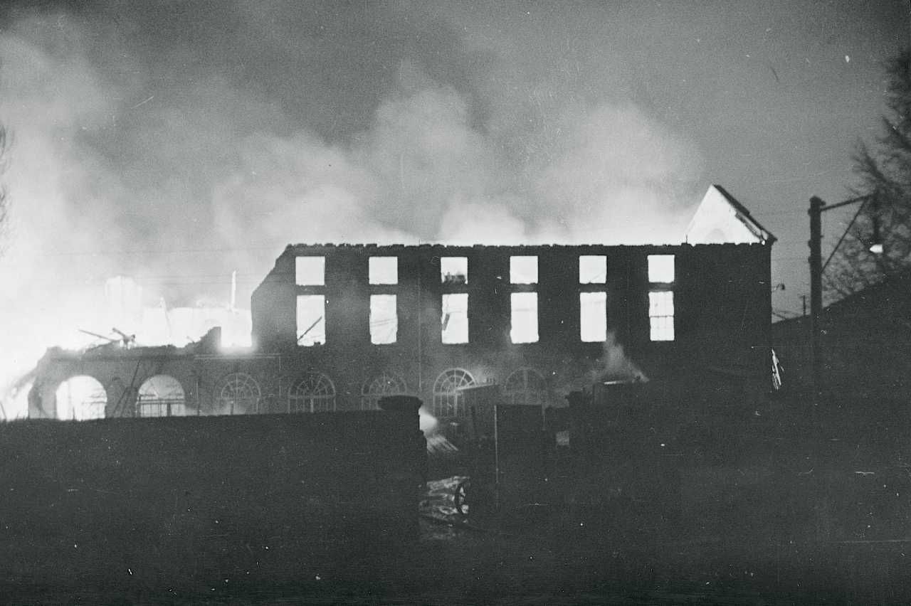 Bygning i flammer efter sabotagen mod H. Hollesens fabrikker og Always den 15. januar 1944.