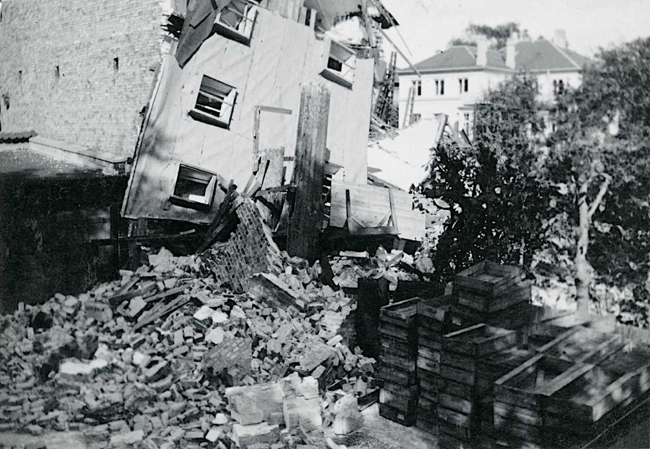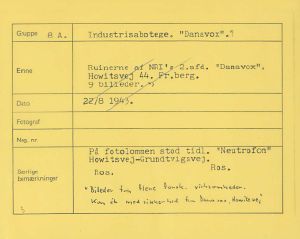 Maskingenkendt tekst fra fotokuvert: Ruinerne afNRIs 2.afd. "Danavox", Howitsviaj 44. Fi.berg. 9 bileder.