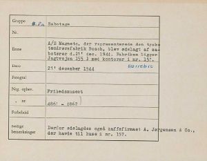 Virksomhederne A/S Magneto, der repræsenterede den tyske tændrørsfabrik Bosch, og kaffefirmaet A. Jørgensen & Co. efter sabotagen den 21. december 1944. Virksomhederne lå i samme bygning.