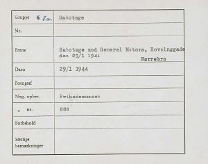 Maskingenkendt tekst fra fotokuvert: Sabotage mod General Motors, Rovsinggade d.29/l 1944. Nørrebro