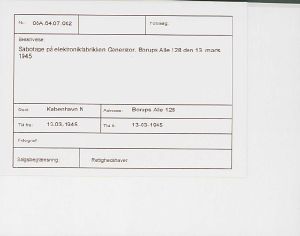 Maskingenkendt tekst fra fotokuvert: Sabotage på elektronikfabrikken Generator, Borups Alle 128 den 13. marts 1945