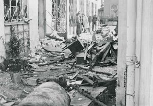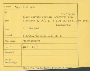 Maskingenkendt tekst fra fotokuvert: Adlers service station, Lyngbyvej 182, ødelægges ved sabotage d. 13/8 1943. Første sabotage var d. 26/9 1942.