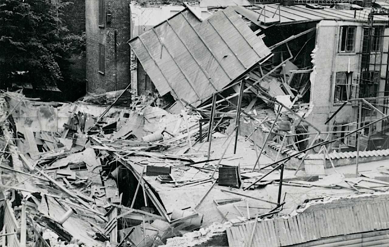 Fabrikken Ambi, der fremstillede ammunition for tyskerne, efter sabotagen den 25.juni 1944.