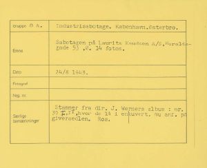 Maskingenkendt tekst fra fotokuvert: Sabotagen på Laurits Knudsen A/S . Haraldsgade 53