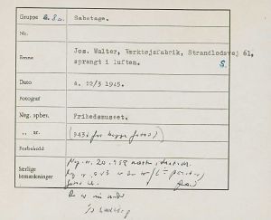 Maskingenkendt tekst fra fotokuvert: Jos. Walter, Værktøjsfabrik, Strandlodsvej 61, sprængt i luften.