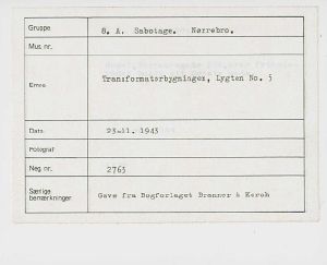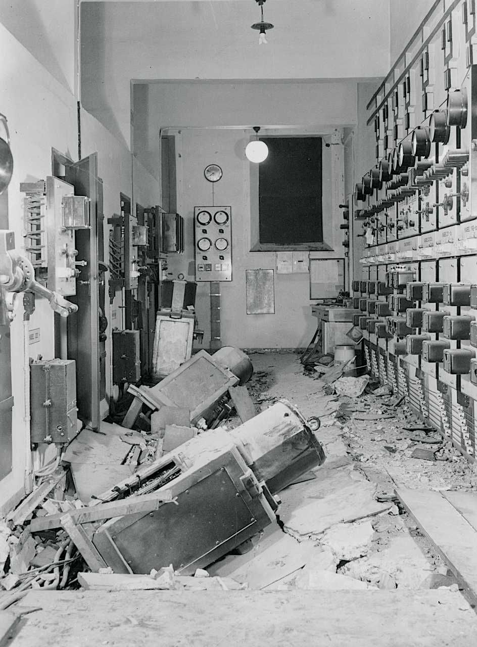 Transformatorbygningen på Lygten i København efter sabotagen den 23. november 1943. Sabotagen blev foretaget af BOPA i samarbejde med SOE.