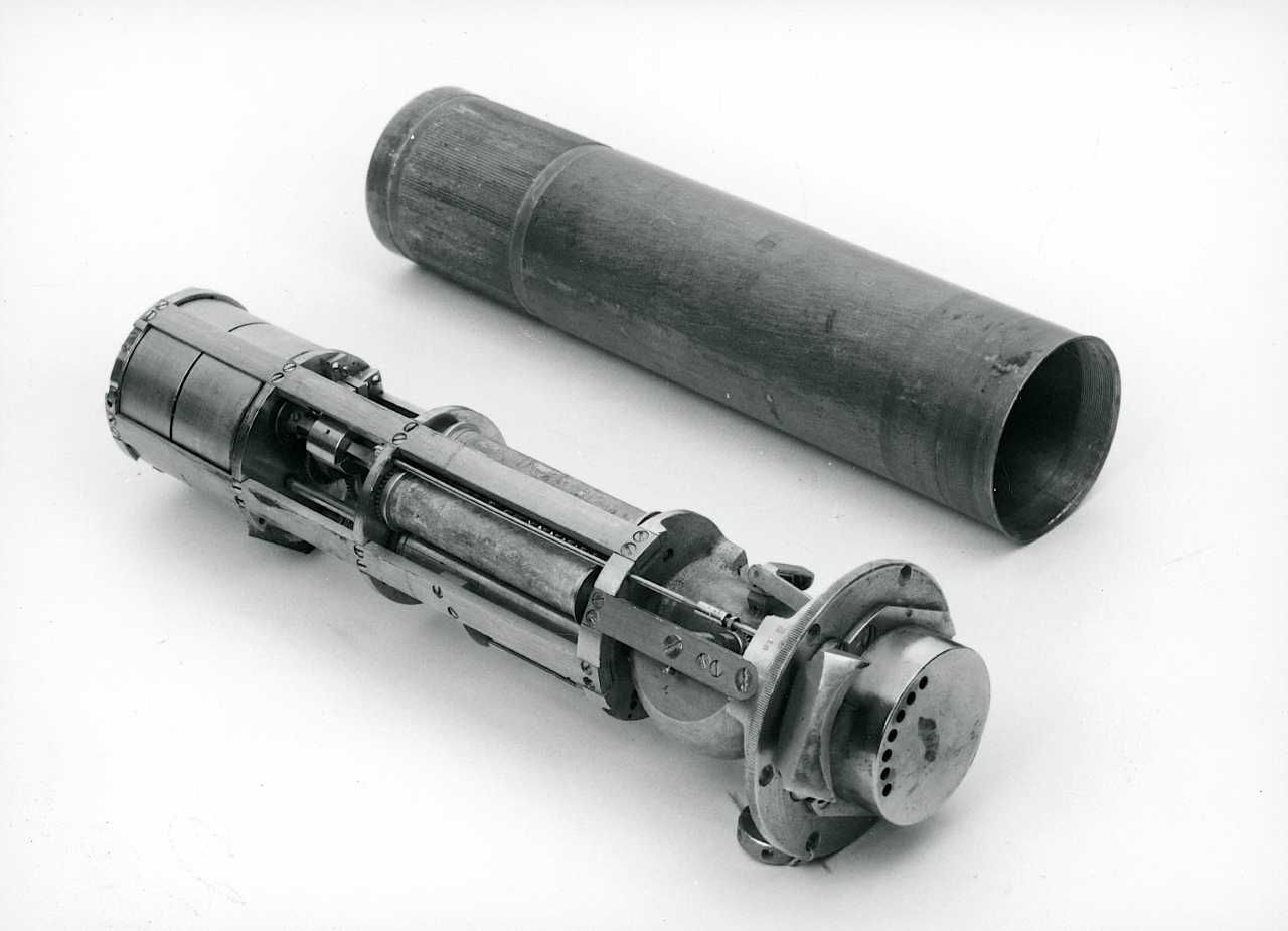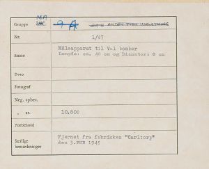 Maskingenkendt tekst fra fotokuvert: Måleapparat til V-l bomber Længde ca. 40 cm og Diamater 8 cm