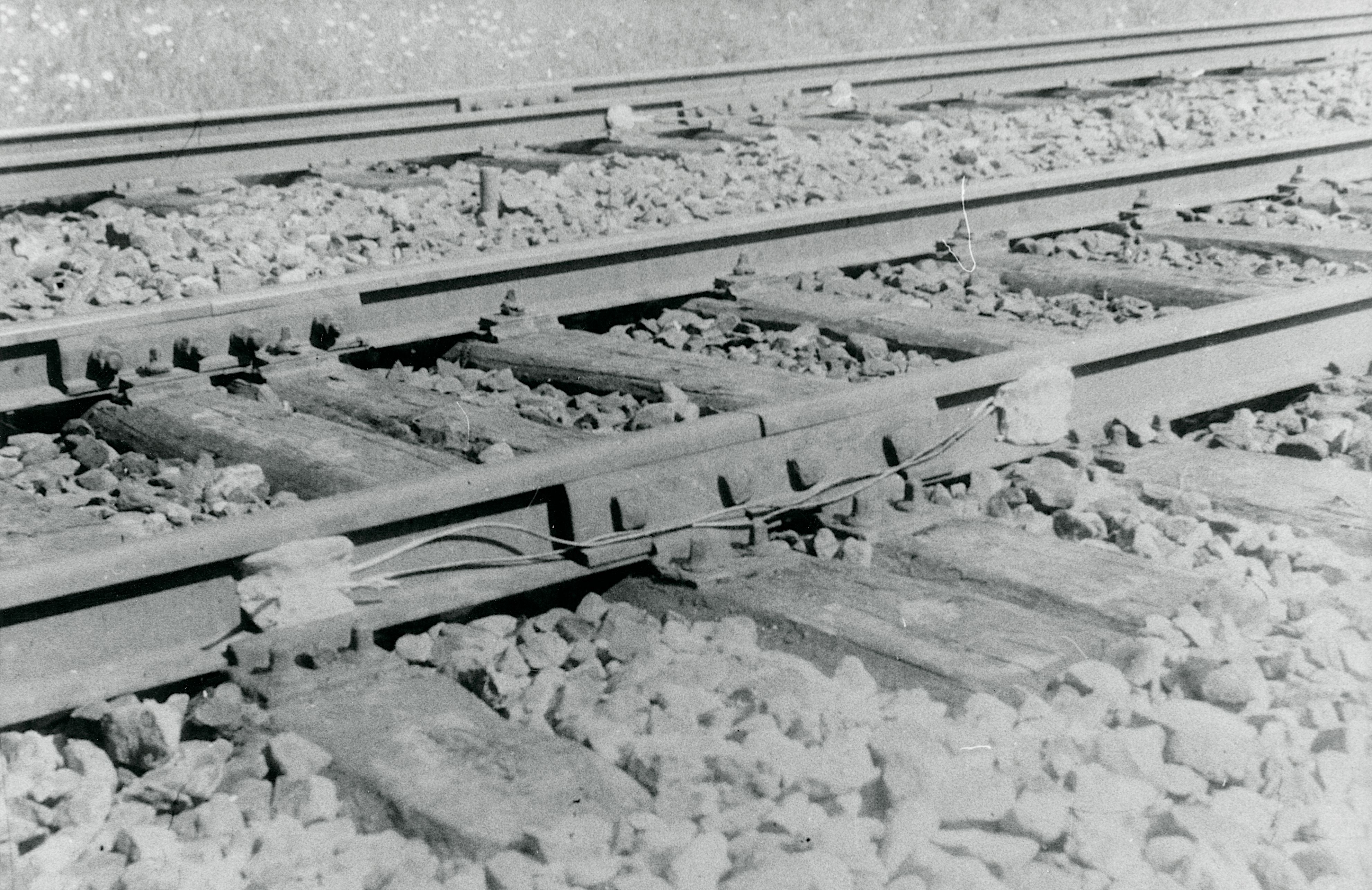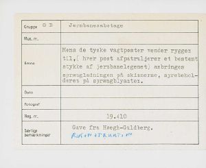 Maskingenkendt tekst fra fotokuvert: Mens de tyske vagtposter vender ryggen til, (hver post afpatruljerer et bestemt stykke af jernbanelegemet) anbringes sprængladningen på skinnerne, syrebeholderen på sprængblyanten.