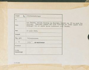 Maskingenkendt tekst fra fotokuvert: Ved Tønder, mellem Døstrup og Skarbæk- Tønder ca. 20 km nord for Skarbæk. Engelske jagere der blev forfulgt af tyske jagere blev nødsaget til at smide deres bombelast over Tønder.