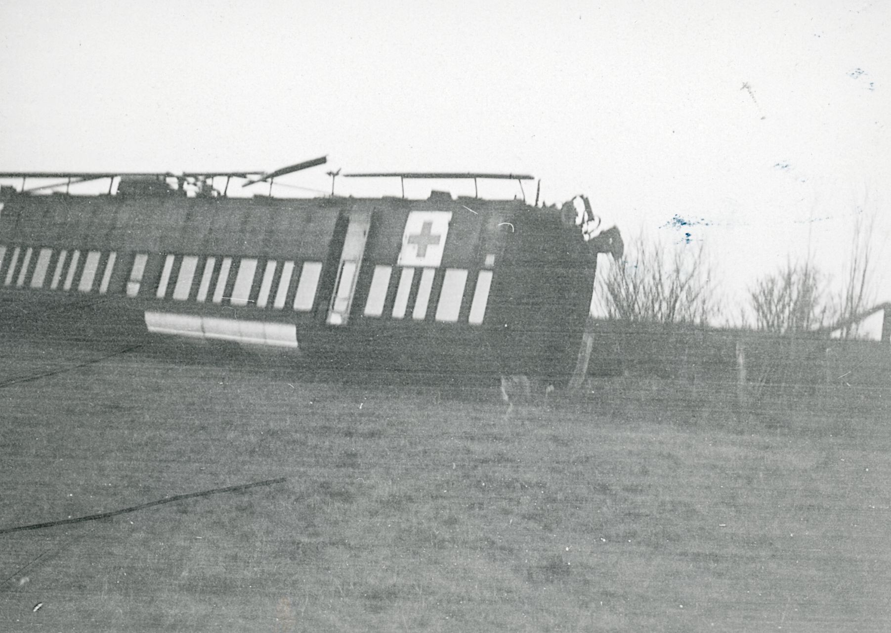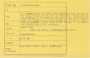 Maskingenkendt tekst fra fotokuvert: Et lasttog der fejlagtig blev saboteret/fordi det blev afsendt forud for troppetransporttoget, der var forsinket.