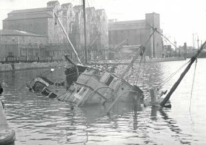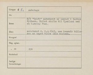 Maskingenkendt tekst fra fotokuvert: M/S "Golfi" saboteret og sænket i Aarhus Sydhavn. Skibet skulle til Tyskland med en ladning fisk.