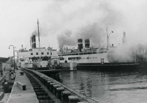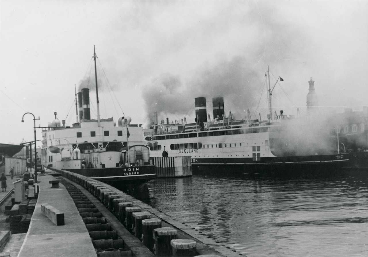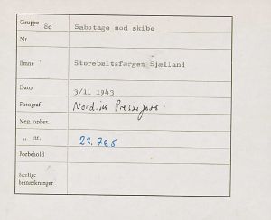 Storebæltsfærgen Sjælland i brand i Korsør Havn efter sabotagen d. 3. november 1943. En bombe sprang under overfarten og en anden efter ankomsten til Korsør. Der var sårede blandt passagererne, og 3 fra redningsmandskabet blev dræbt