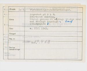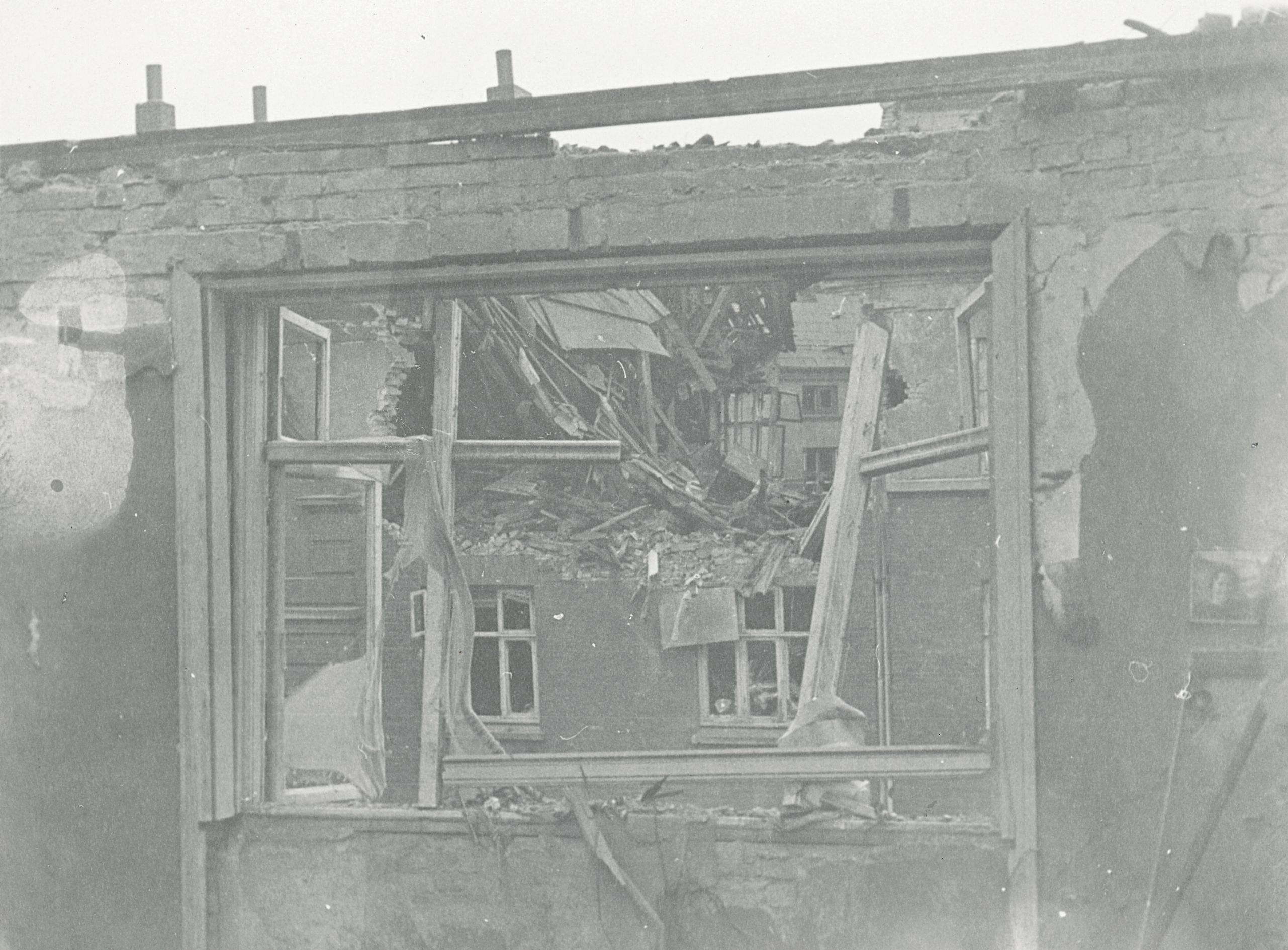 Maskingenkendt tekst fra fotokuvert: Angrebet på B & W. Kvarteret omkring. Udsigt fra et ovalt vindue overfor Gunløgsgade 6. Nemlig fra Gunløgsgade 5.