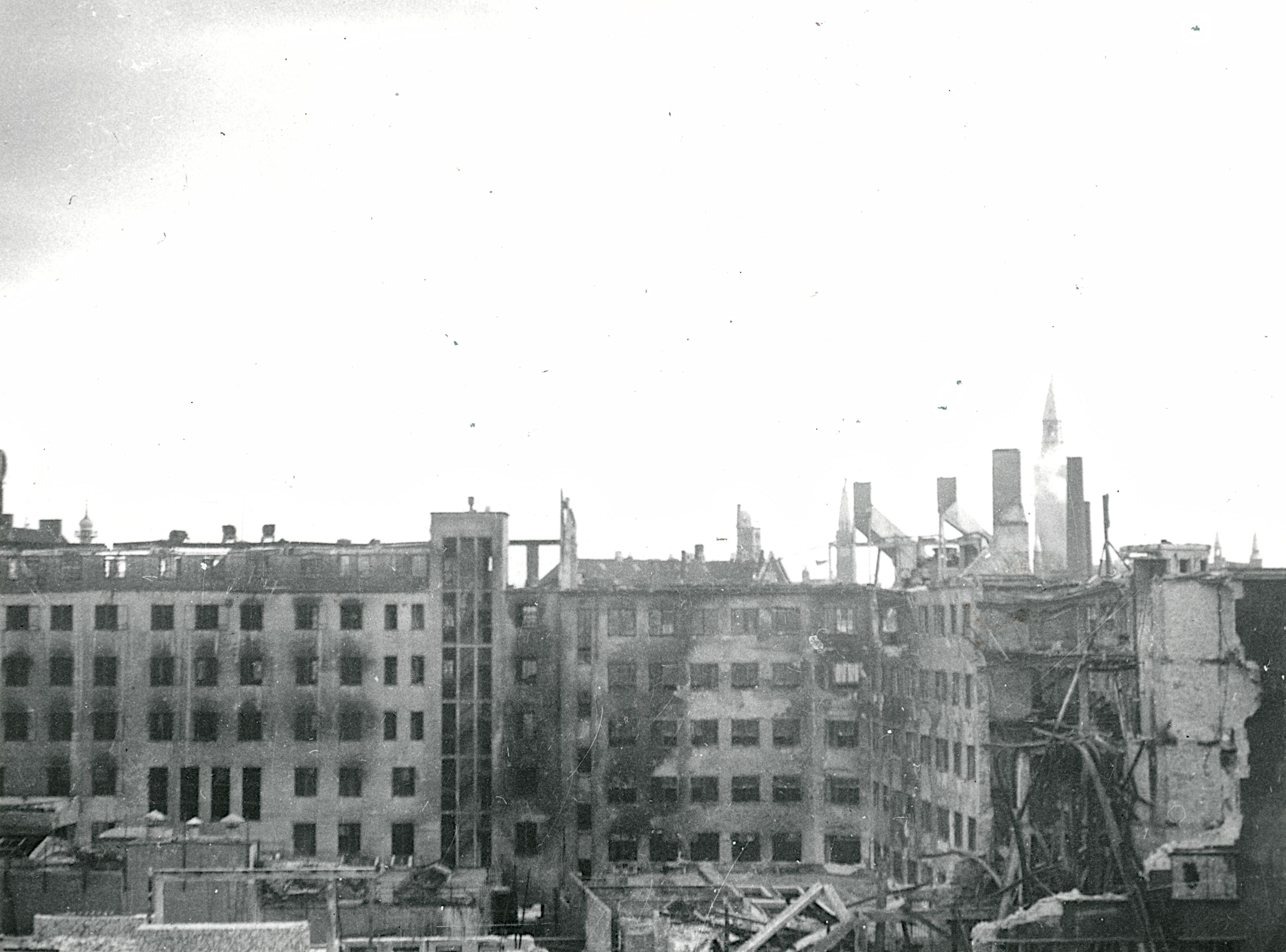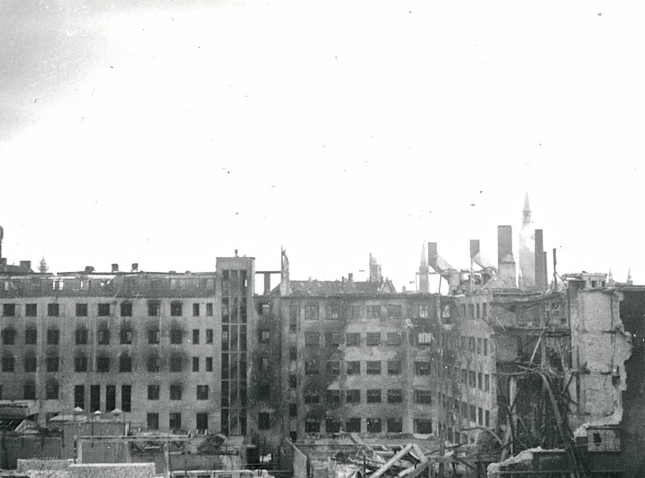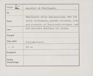 Maskingenkendt tekst fra fotokuvert: Shellhuset efter ødelæggelsen.