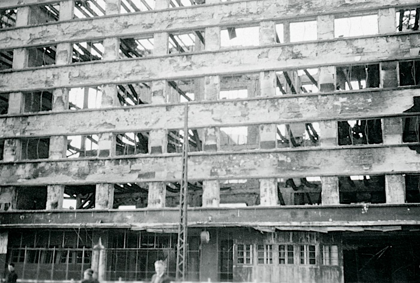 Maskingenkendt tekst fra fotokuvert: Ruinerne af Shellhuset efter branden som følge af flyveangrebet d. 21 marts 45.