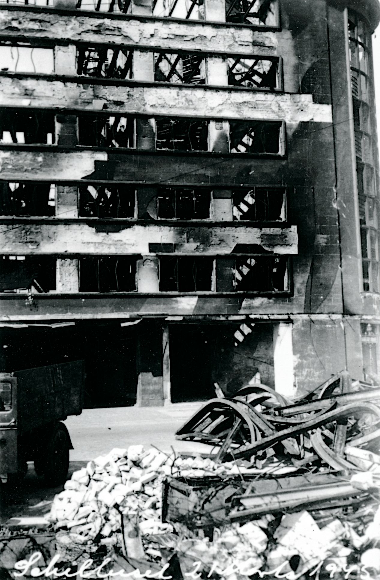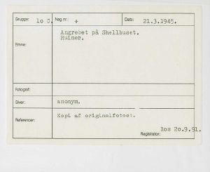 Maskingenkendt tekst fra fotokuvert: Angrebet på Shellhuset. Ruinen.