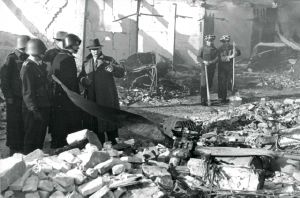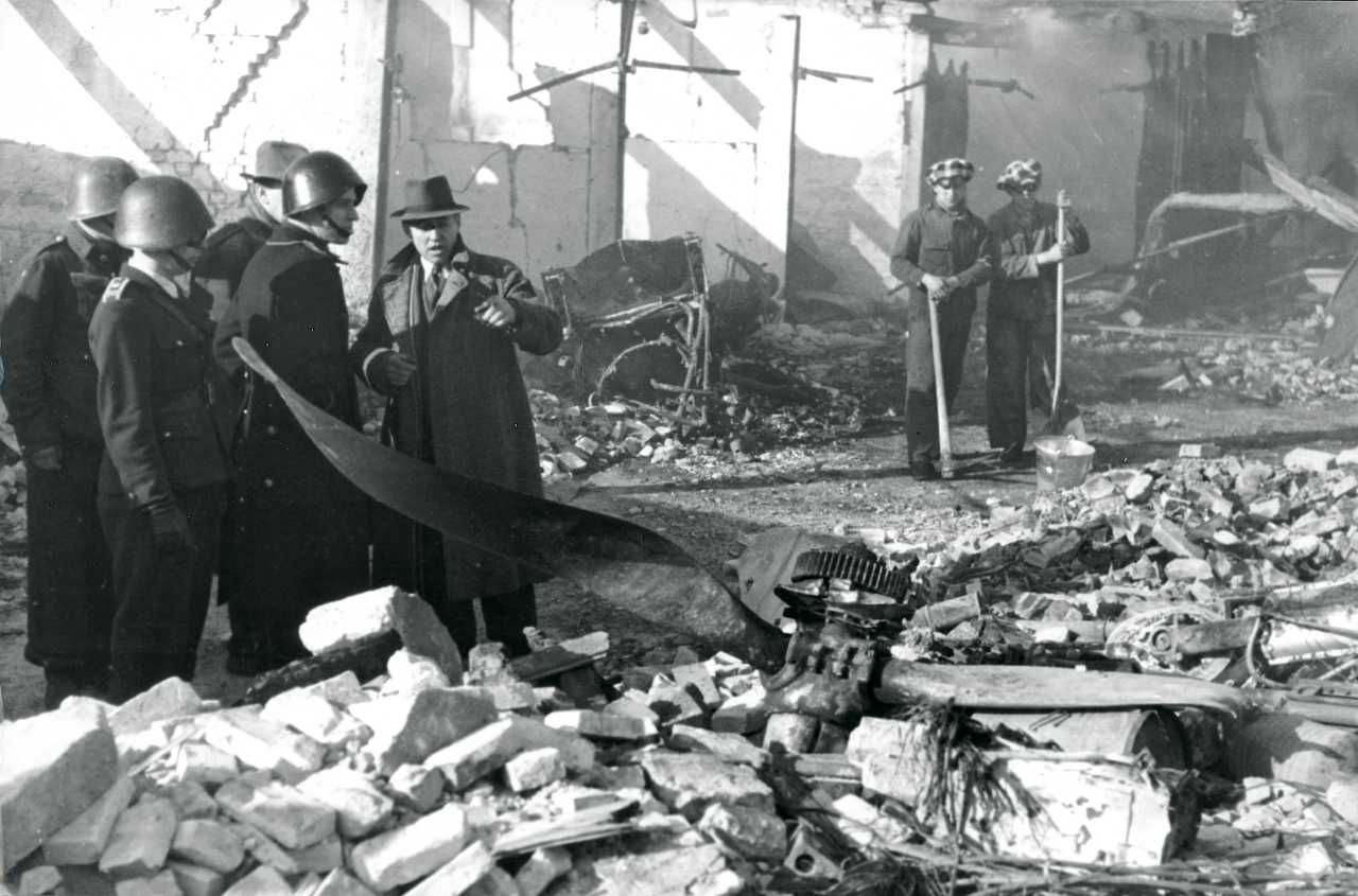 Maskingenkendt tekst fra fotokuvert: Oprydningsarbejde i Alleenberggaragerne hvor et fly styrtede ned. Flyets propel i forgrunden.