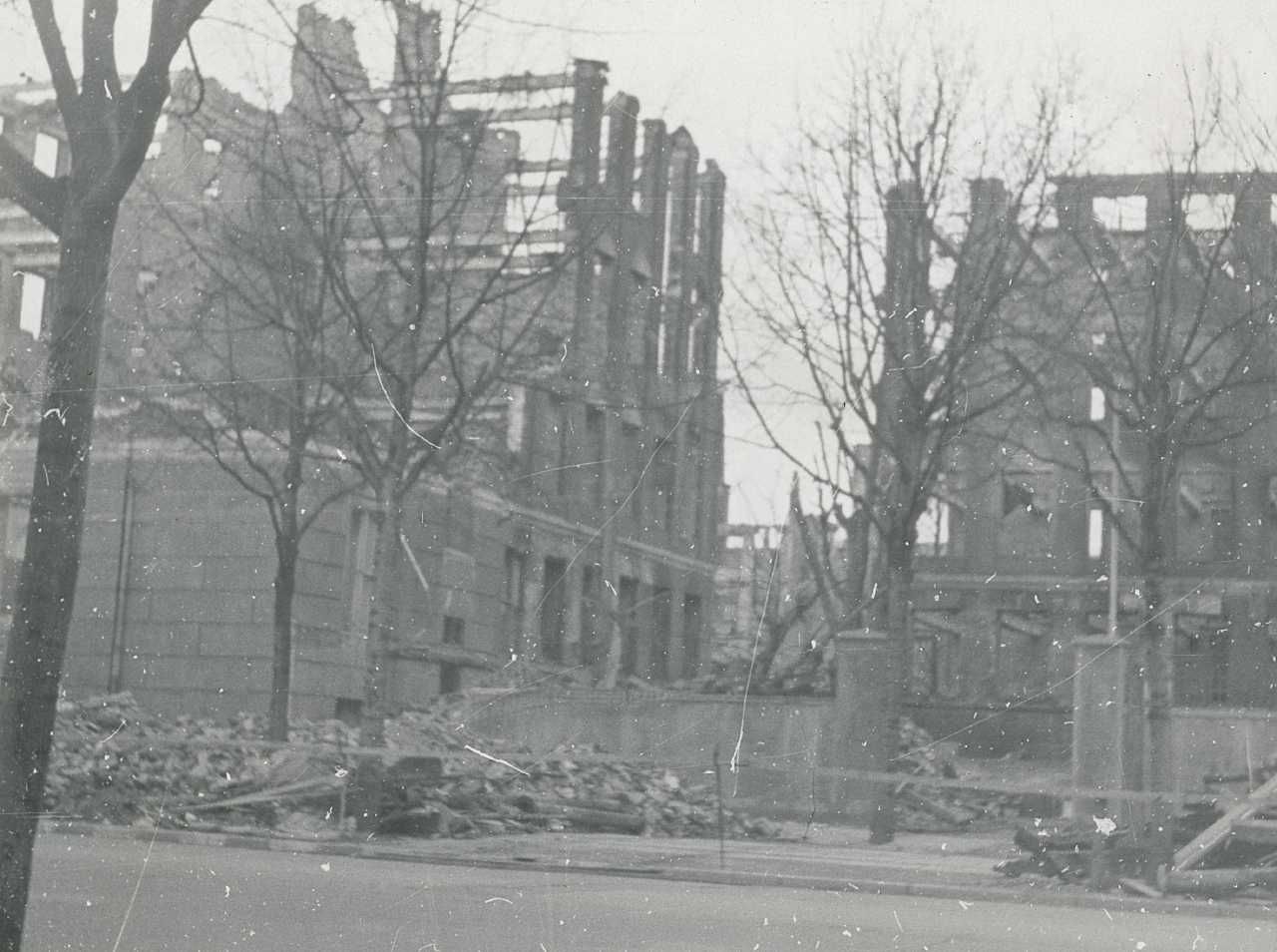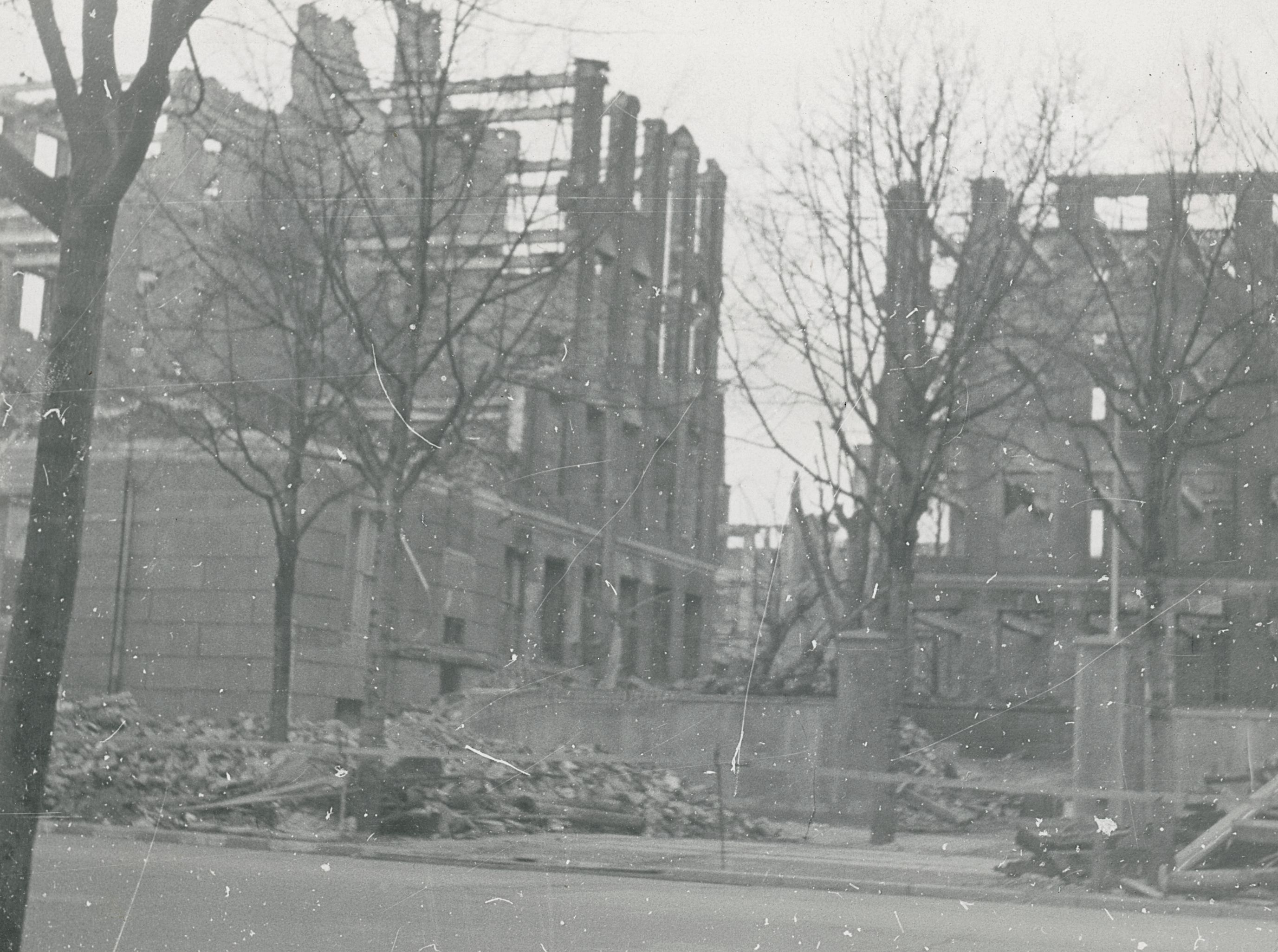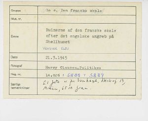 Maskingenkendt tekst fra fotokuvert: Ruinerne af den franske skole efter det engelske angreb på Shellhuset