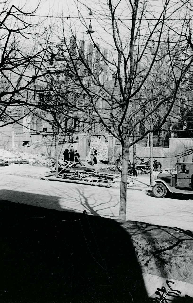 Maskingenkendt tekst fra fotokuvert: Ruiner af Den Franske Skole. Rydningsarbejde påbegyndt