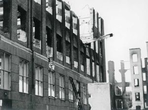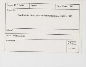Maskingenkendt tekst fra fotokuvert: Den Franske Skole, efter fejlbombningen d. 21 marts 1945