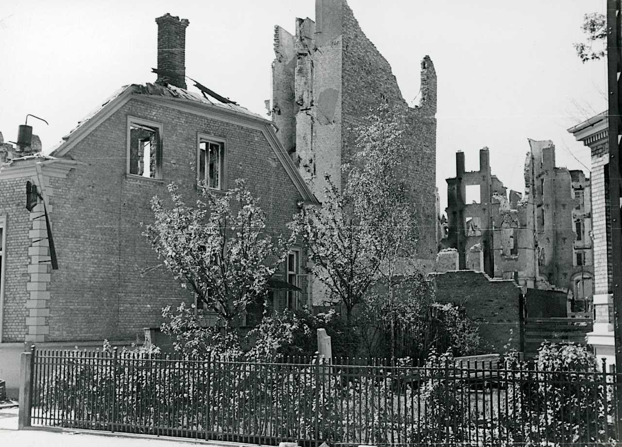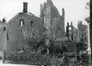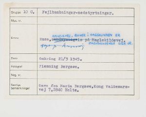 Maskingenkendt tekst fra fotokuvert: Huse, Amicisvej. I baggrunden ruiner på Maglekildevej.
