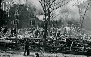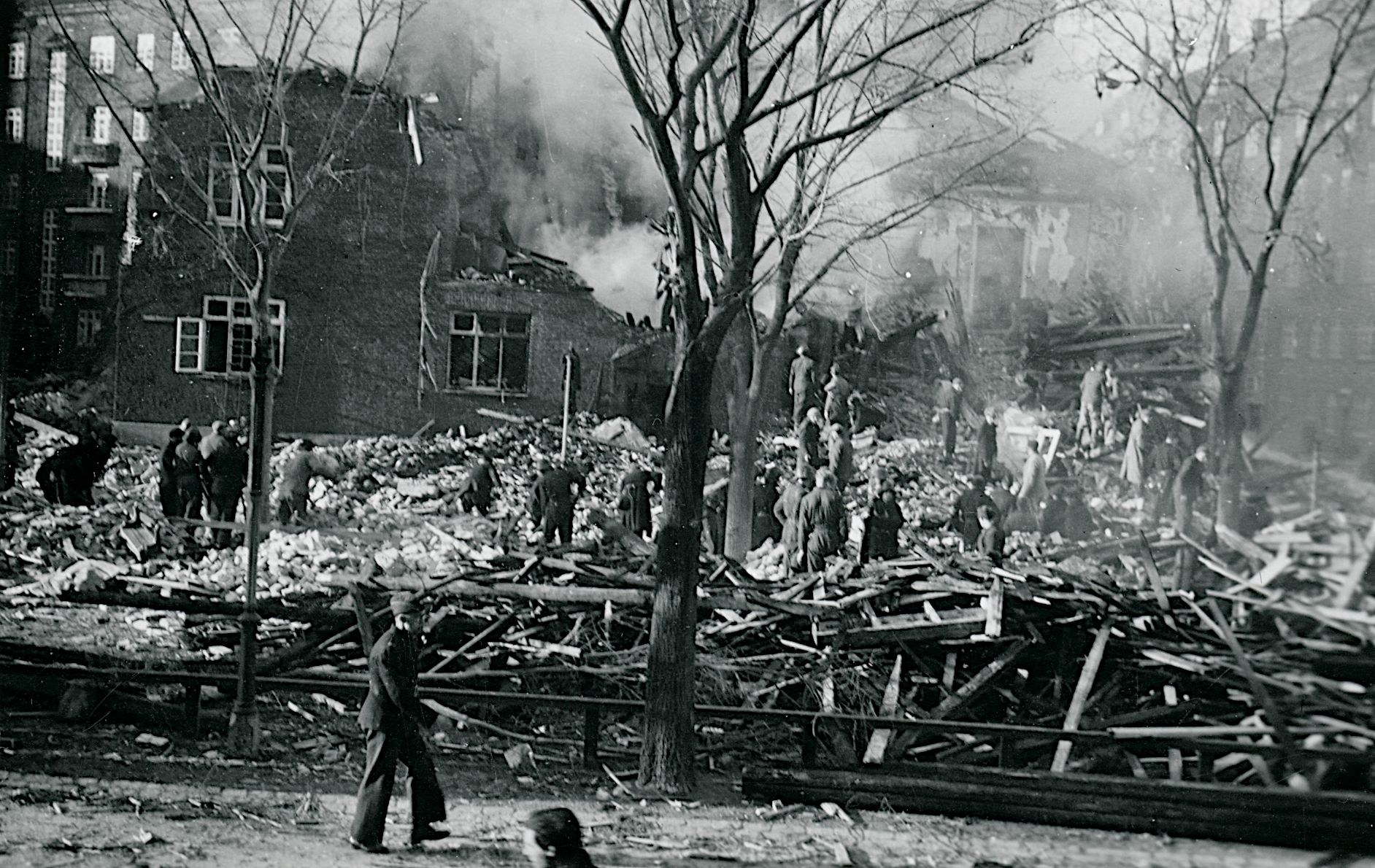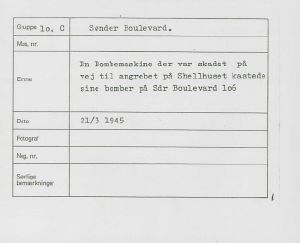 Maskingenkendt tekst fra fotokuvert: En Bombemaskine der var skadet på vej til angrebet på Shellhuset kastede sine bomber på Sdr Boulevard 106