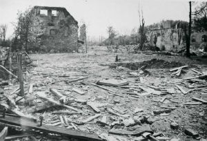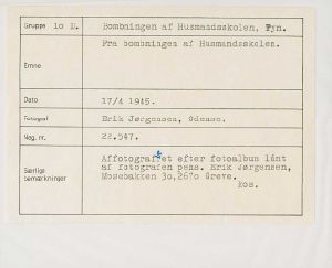 Maskingenkendt tekst fra fotokuvert: Fra bombningen af Husmandsskolen.