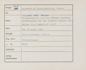 Maskingenkendt tekst fra fotokuvert: Husmandsskolen var som bekendt gestapo-hovedkvarter for Fyn igennem længere tid. Skolen blev bombet af R.A.F.