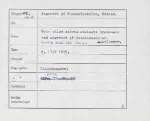 Maskingenkendt tekst fra fotokuvert: Helt eller delvis ødelagte bygninger ved angrebet på Husmandsskolen