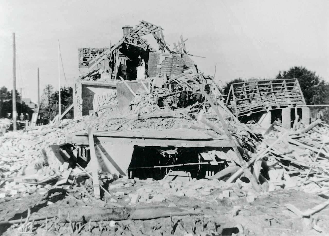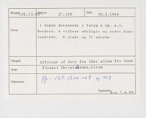 Maskingenkendt tekst fra fotokuvert: Et bombe detoneret i Vorup 4 km. s.f. Randers. 4 villaer ødelagte og andre huse raserede. 6 dræbt og 11 sårede.