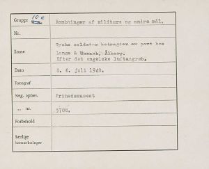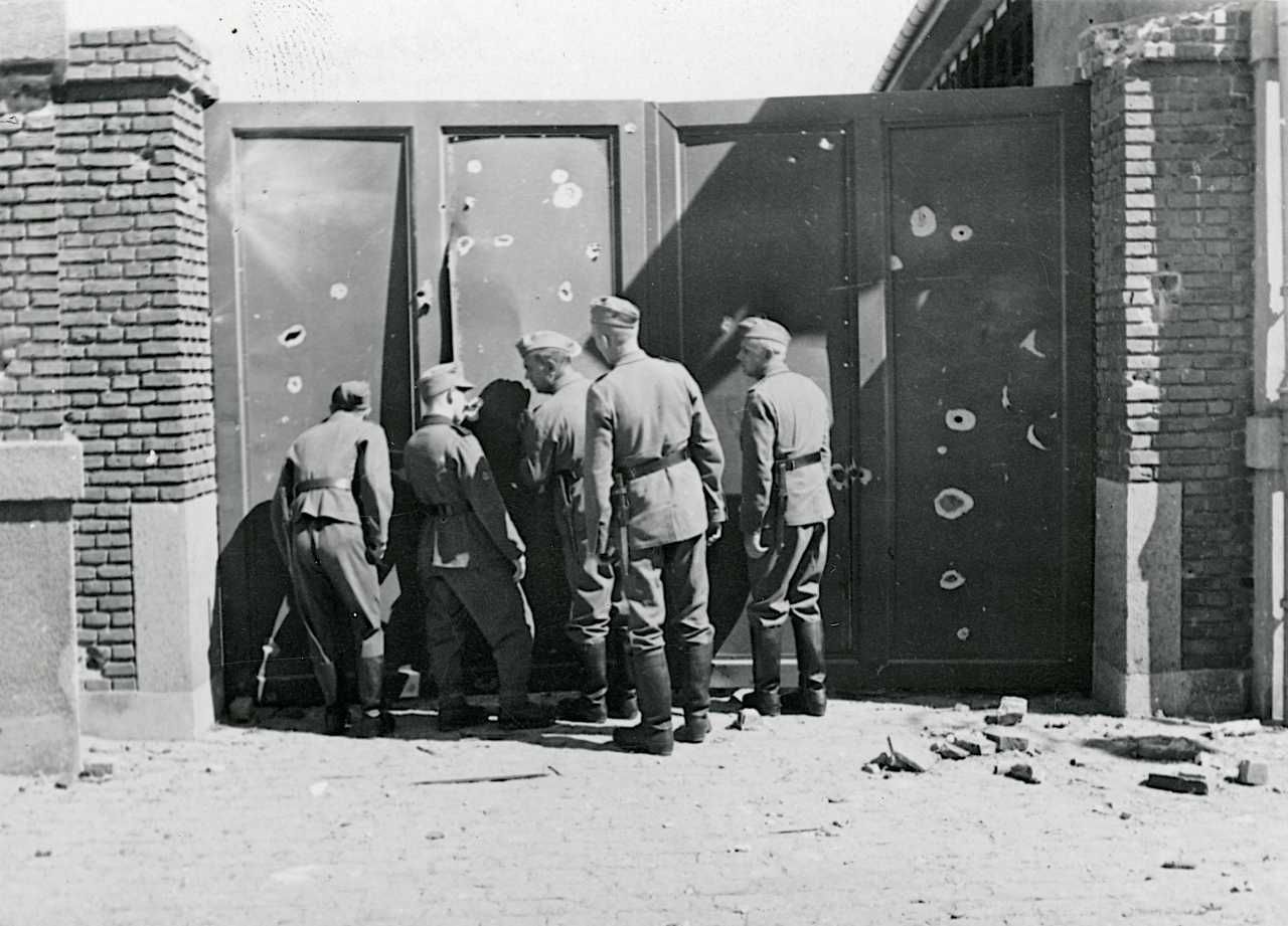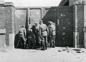 Maskingenkendt tekst fra fotokuvert: Tyske soldater betragter en port hos Lange & Unmack, Ålborg. Efter det engelske luftangreb