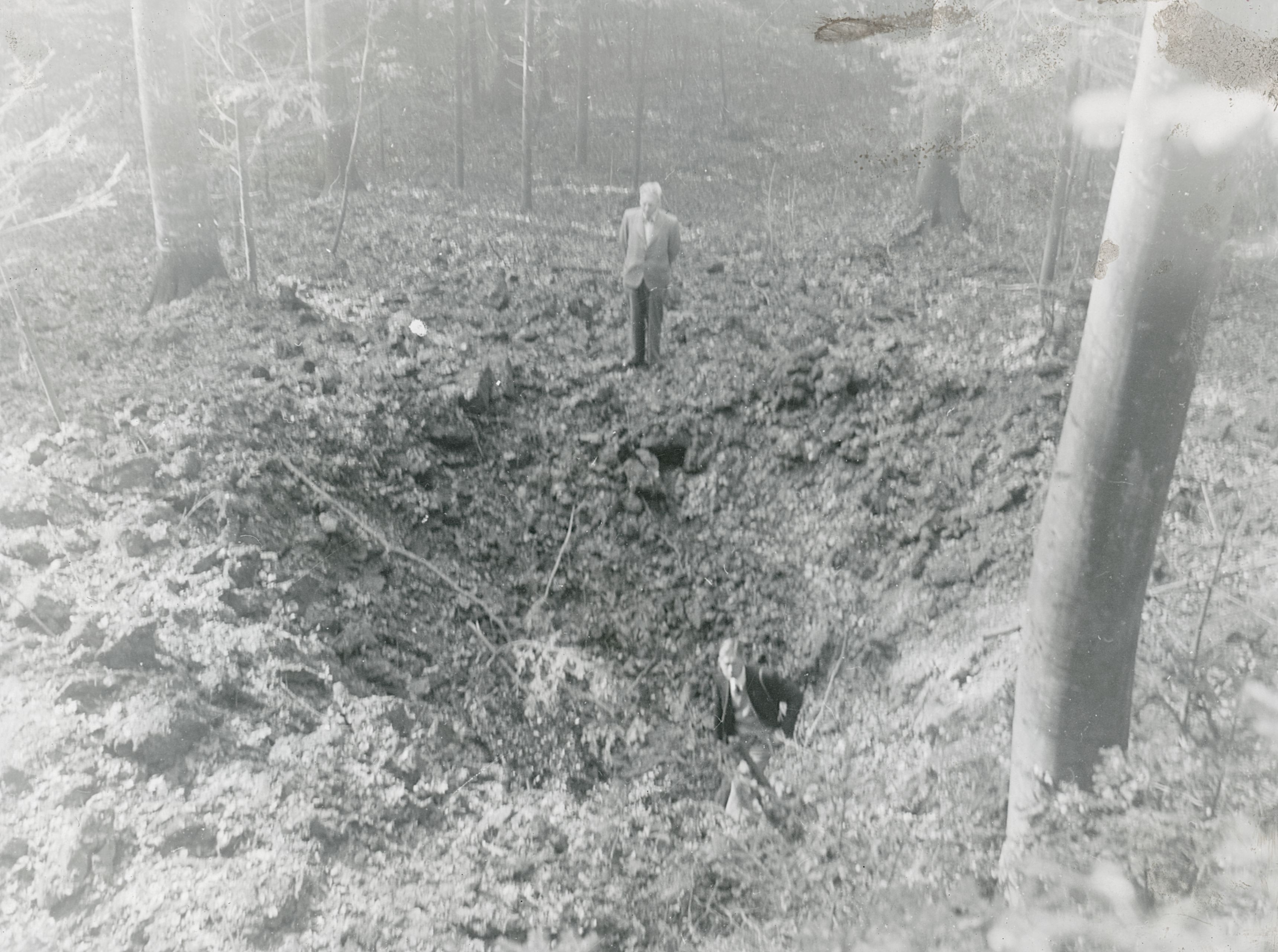 Maskingenkendt tekst fra fotokuvert: Bombekrater efter engelske angreb ved Lindholm