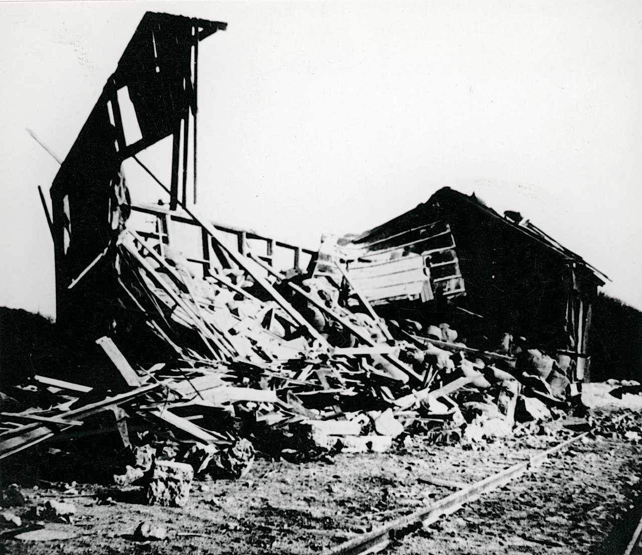 Den 25/4 1941 angreb en britisk Blenheim bombemaskine banegården i Ringkøbing og nedkastede fire 250 punds sprængbomber. Her ses et ødelagt pakhus