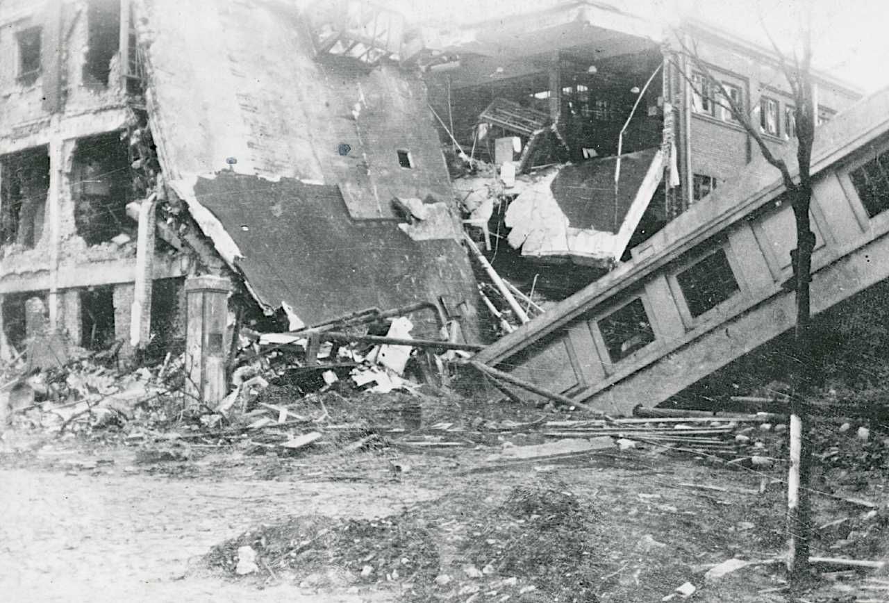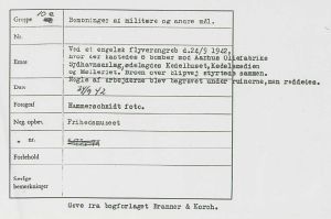 Maskingenkendt tekst fra fotokuvert: Ved et engelsk flyverangreb d. 24/9 1942, hvor der kastedes 8 bomber mod Aarhus Oliefabriks Sydhavns anlæg. ødelagdes Kedelhuset, Kedelsmedien og Mølleriet. Broen over Slipvej styrtede i sammen. Nogle af arbejderne blev begravet under ruinerne, men reddedes.