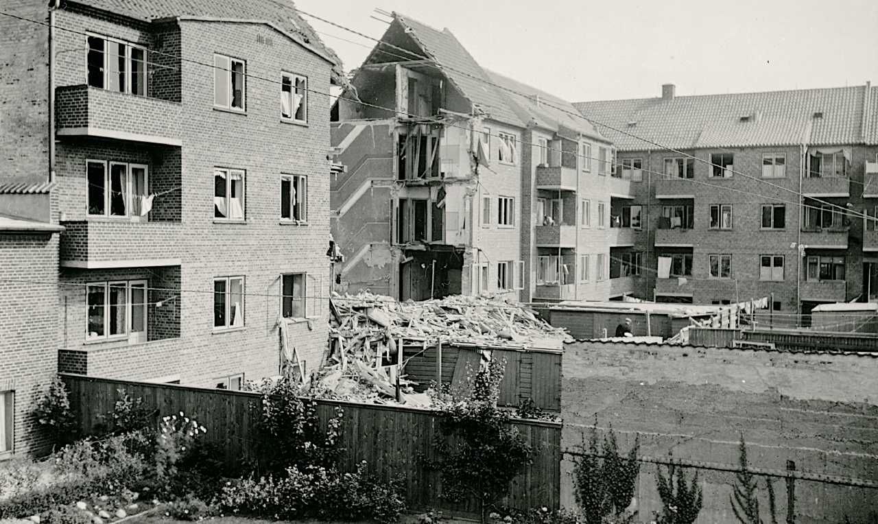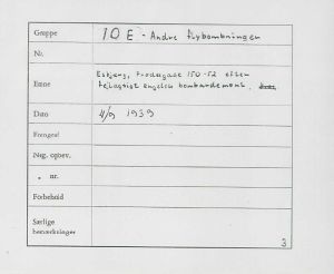 Maskingenkendt tekst fra fotokuvert: Esbjerg, Frodesgade 150-152 efter fejlagtigt engelsk bombardement