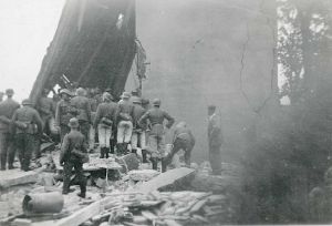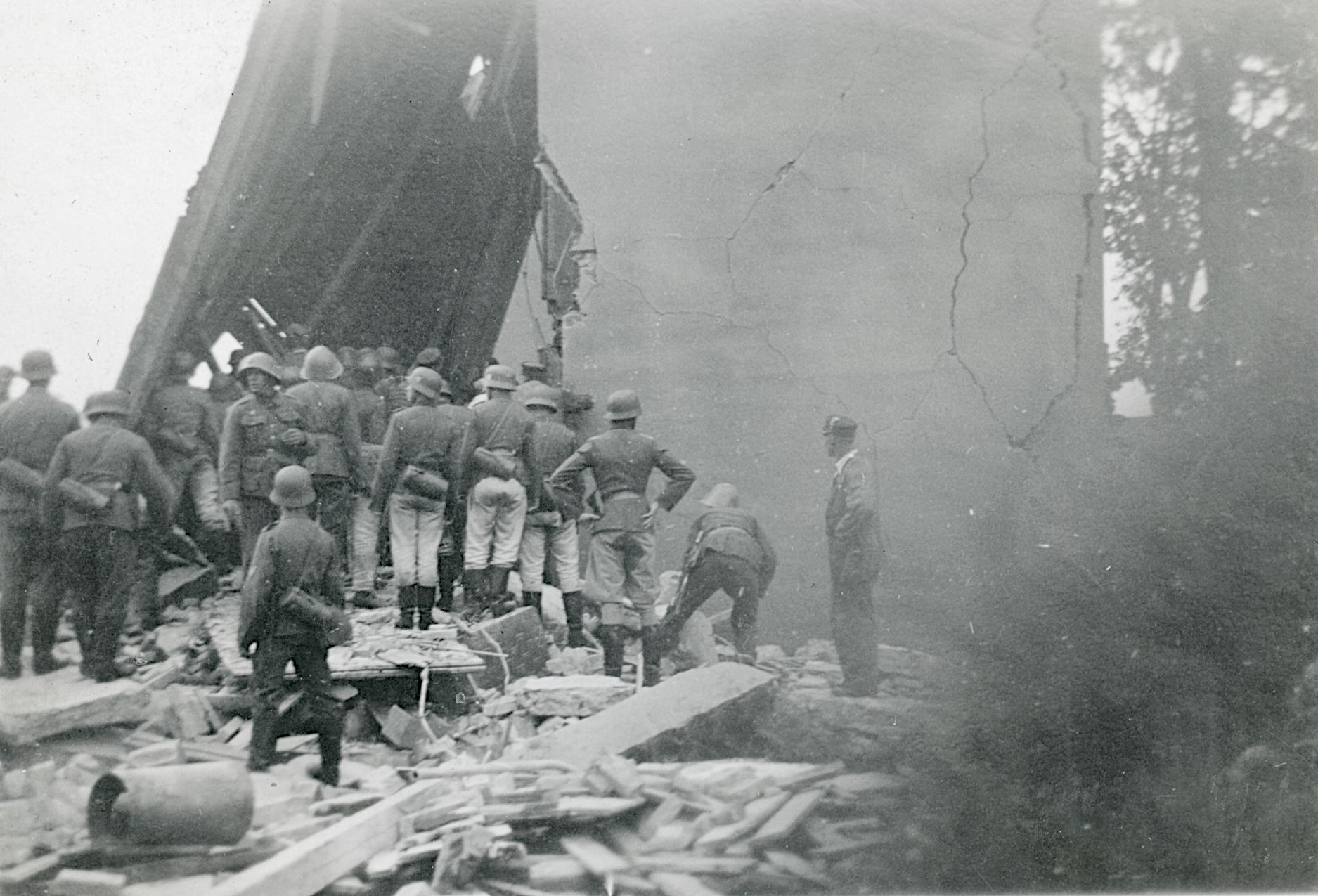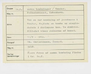 Maskingenkendt tekst fra fotokuvert: Ved en RAF bombning af jernbanen i Tønder, fejlede en bombe og eksploderede i dyrlægens hus. To dræbtes.
