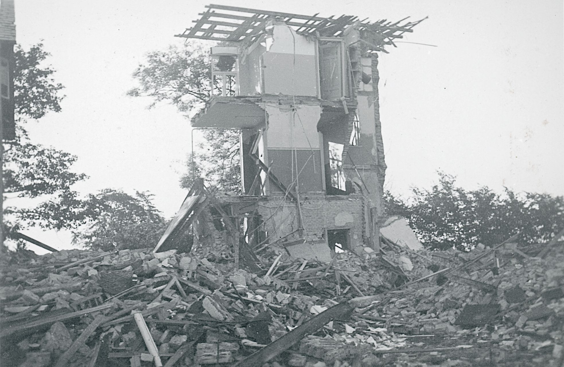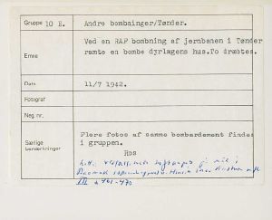 Maskingenkendt tekst fra fotokuvert: Ved en RAF bombning af jernbanen i Tønder ramte en bombe dyrlægens hus. To dræbtes.