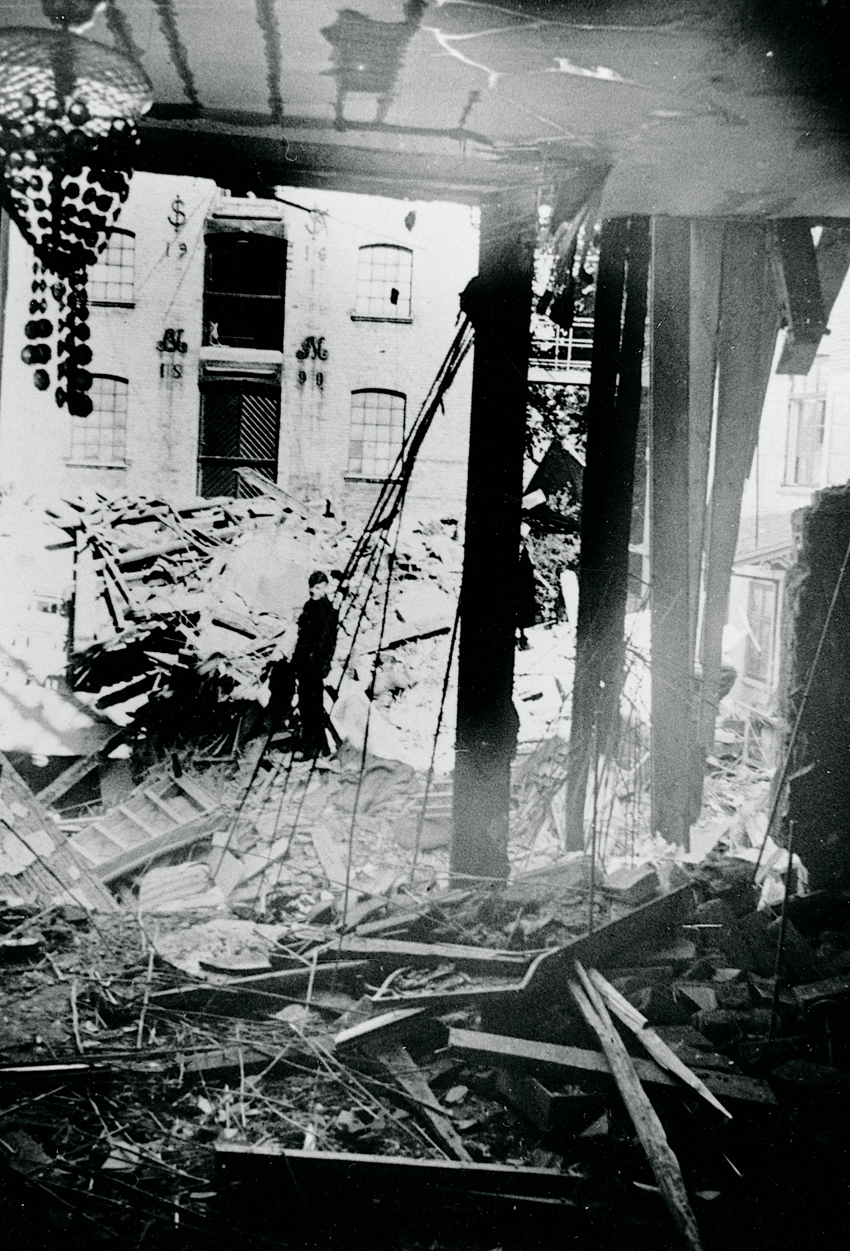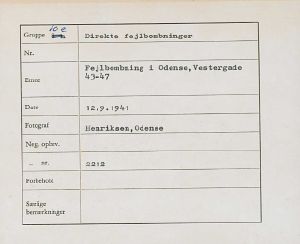 Maskingenkendt tekst fra fotokuvert: Fejlbombning i Odense, Vestergade 43-47.