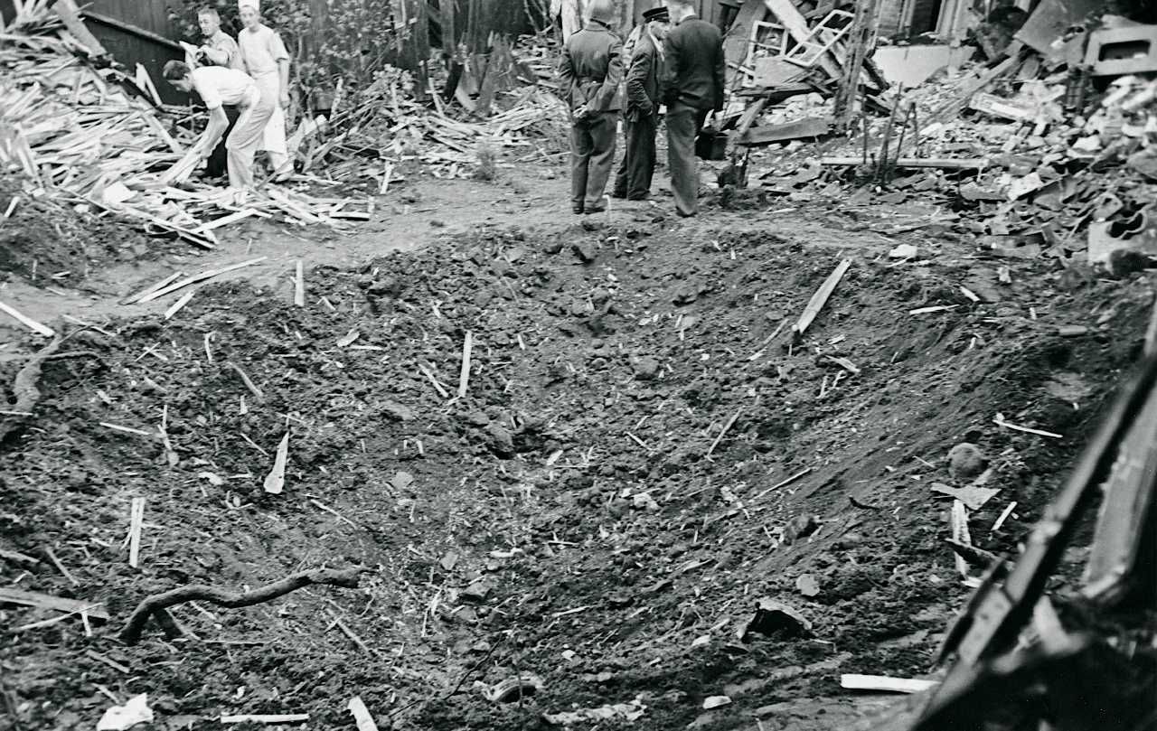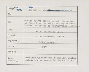 Maskingenkendt tekst fra fotokuvert: Odense by rystedes d. 12.sep. om natten af flere drøn fra eksploderede bomber. De tabtes af overflyvende allierede maskiner