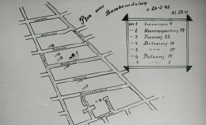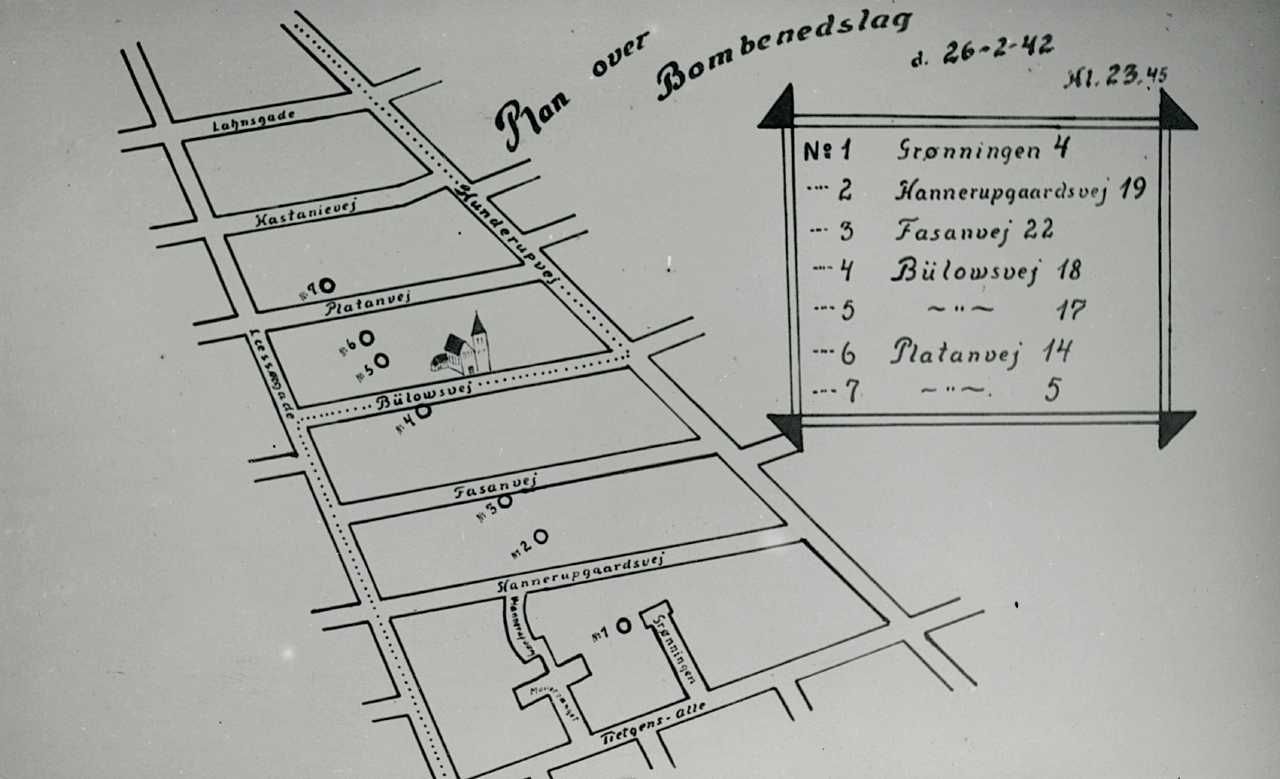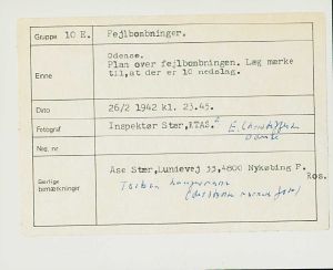 Maskingenkendt tekst fra fotokuvert: Odense. Plan over fejlbombningen. Læg mærke til at der er 10 nedslag.